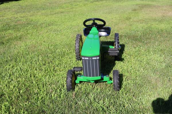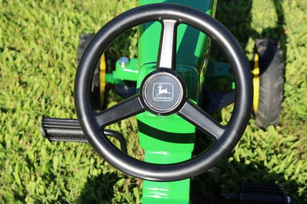 John Deere 8310 Pedal Tractor licensed by John Deere and made by in the USA by the Ertl Corp. Cast iron construction. It's in beautiful shape. Always stored inside. An excellent generational pedal tractor for the family. This classic metal ride-on toy features authentic decals, a working steering wheel, functional pedals, adjustable seat and durable rubber tires. It's in beautiful shape and ready for the young ones to ride.
