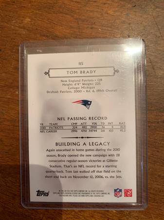 These are 5 different TOM BRADY-NEW ENGLAND PATRIOTS NFL FOOTBALL Cards. See the pictures-all are in NM-MT shape. They are all in a soft sleeve and a rigid holder. It's $25 for all 5 cards together. They can be picked up in Westminster or shipped (extra).