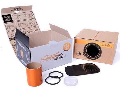 A fun portable novelty smartphone projector and is all cardboard except for the lens
