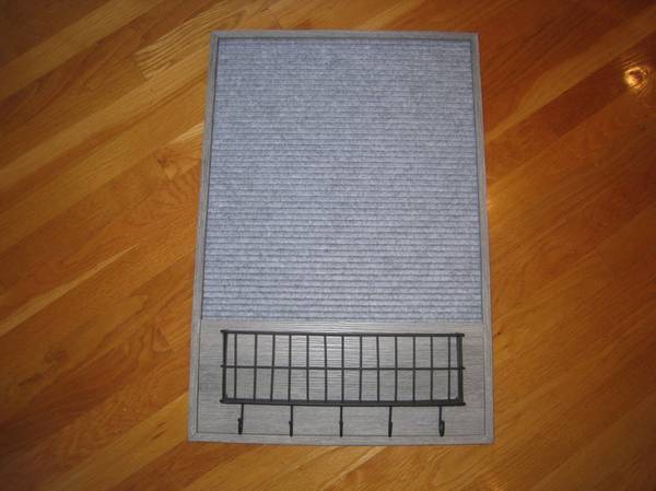 Modern framed felt message board with push-in letters, numbers and symbols, a metal basket and five (5) hanging hooks